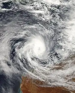 On 27 February 2008 the Tropical Cyclone Warning Centre (TCWC) in Darwin identified a Tropical Low near the Northern Territory, and began issuing tropical cyclone advisories on the system.[53] On 29 February, the JTWC issued a Tropical Cyclone Formation Alert on the developing system.[54] On 1 March, the JTWC issued their first warning on Tropical Cyclone 21S.[55] The low moved into TCWC Perth's area of responsibility during the day. The low strengthened as it moved off the Kimberley coast, and was upgraded to Tropical Cyclone Ophelia by TCWC Perth.[56] Ophelia intensified to a Category 2 cyclone on the Australian scale early on 2 March. The JTWC briefly upgraded Ophelia to a Category 1 cyclone on the Saffir–Simpson scale later that day, but was downgraded to a tropical storm on the next advisory. Ophelia continued on a general south-westerly track parallel to the coast, and eventually weakened out to sea as TCWC Perth discontinued advisories.[57]