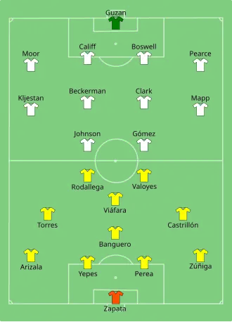 - ^ Hugo Rodallega played as a goalkeeper after Róbinson Zapata was sent off.