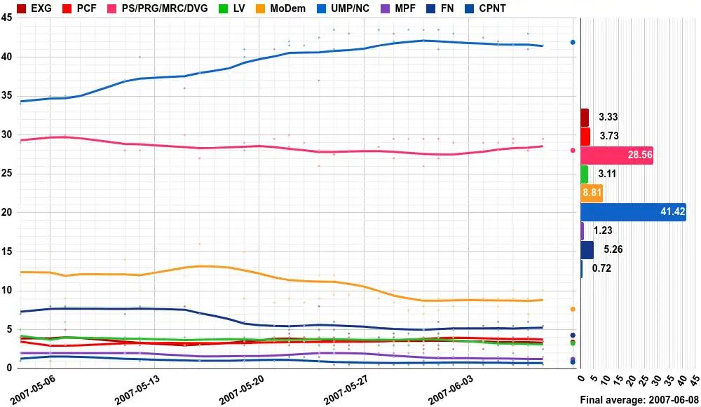 Opinion polls and seat projections gave President Nicolas Sarkozy's UMP-led coalition a wide lead, sometimes nearing three-quarters of all 577 seats. The UMP polled marginally above 40%, around a 10-point increase over its score of 33% in the first round of the 2002 elections. Prime Minister François Fillon, also a candidate in Sarthe, led the UMP campaign. On the far-right, following Jean-Marie Le Pen's relatively low score in the presidential election, the National Front tried to regain lost ground in the legislative election, but opinion polls gave the FN only 4 or 5 per cent of votes, one of its lowest scores in a general election.