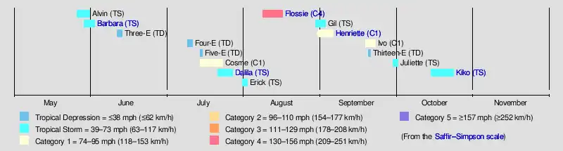 | Henriette | August 30 – September 6 | Category 1 hurricane | 85 (140) | 972 | Southwestern Mexico, Western Mexico, Baja California Peninsula, Northwestern Mexico (Sonora) | $25 million | 11 | |||