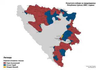 The presidential election of 2007 in the Republika Srpska entity of Bosnia and Herzegovina was announced after the premature death of President Milan Jelić on 30 September 2007 and was held on 9 December 2007.[1] Until the election took place, Igor Radojičić, also from the ruling Alliance of Independent Social Democrats, was acting president.[2] The election had to be called within fifteen days of Jelić's death;[3] it was called on 11 October 2007, with candidates to be nominated by 16 October 2007.[4]