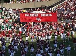 In the preseason, Oklahoma was picked by the Big 12 media to finish second in the conference.[4] At the time, the starting quarterback had not been chosen. A little over a week before the first game, freshman quarterback Sam Bradford was announced as the starter.[5] In his first game as a collegiate quarterback, Bradford threw for over 350 yards in the first half, he tied Heisman Trophy winner Jason White's record of 18 consecutive pass completions, and threw for five touchdowns. He came out of the game early in the 3rd quarter.[6][7][8] Since then, Bradford led the nation in passing efficiency for most of the season.[9][10][11][12] With the question at quarterback answered, some felt this team could be the best in the nation, but with an unexpected loss at Colorado, the chances were slim. The Sooners continued to play strong following the loss and again rose in the polls as more teams above them also lost. Back in the #3 spot, the Sooners traveled to Lubbock, Texas to take on the Red Raiders to clinch the Big 12 South Division title. However, Bradford was injured on the opening play for the Sooners as they quickly fell behind. It was 27–10 at the halftime. Oklahoma mounted a comeback in the 4th quarter but it was not enough. The Sooners lost their second game and again were knocked out of the national title picture.[13][14] In their next game against Oklahoma State, in what is referred to as Bedlam, the Sooners dominated winning 49–17 and locking up their spot in the Big 12 Championship Game.[15] In the Big 12 Championship, Oklahoma faced Missouri, then the number one ranked team in the nation. The two faced each other in the regular season in Norman, Oklahoma with the Sooners winning 41–31. The Sooner defense dominated the game and the offense pulled away in the 2nd half. Oklahoma won 38–17 to claim their 5th Big 12 Conference Championship and 41st total conference championship.