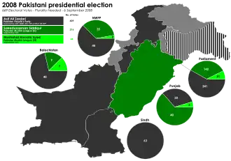 An indirect presidential election was held on 6 September 2008 in Pakistan.[1] The Electoral College of Pakistan – a joint sitting of the Senate, National Assembly and Provincial Assemblies – elected a new president after the resignation of President Pervez Musharraf.[2] As required by the constitution, Muhammad Mian Soomro (in his position as Chairman of the Senate of Pakistan) automatically became acting president on 18 August 2008, upon the resignation of Musharraf.[3] The constitution required that a new president be elected by Parliament within 30 days; Soomro was considered loyal to Musharraf, and it was considered certain that he would be replaced in that election.[4]