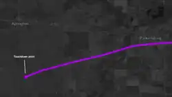 Past New Hartford, the tornado weakened dramatically and passed just north of Waterloo and Cedar Falls, shrinking to about 1⁄4 mile (400 m) in width as it continued to impact rural areas. Damage along this section of the path was mostly minor, though a few farms sustained EF2 damage. Intense cycloidal marks were again noted in farm fields in this area.[1][2] As the tornado approached Dunkerton, it turned to the east-northeast, missing the town and growing up to 1.2 miles (1.9 km) wide. Some re-intensification occurred in this area, as consistent high-end EF2 damage was noted at multiple farms. Numerous hog containment buildings were destroyed, and a few homes that were impacted sustained some collapse of exterior walls. Mud and corn stubble was picked up from farm fields near Dunkerton and plastered thickly against fences, power poles, and houses. Shortly before reaching Fairbank, the tornado abruptly dissipated.[1][2]