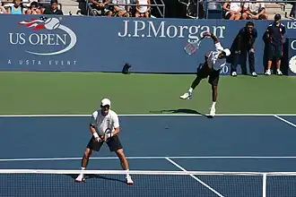 Bob Bryan and Mike Bryan started their 2008 season with an unsuccessful defense of their 2007 Australian Open title, where they were upset in the quarterfinals of the Australian Open (lost to Bhupathi/Knowles).[39] The Bryans matched their 2007 French Open performance with a quarterfinal appearance in Paris (lost to Cuevas/Horna),[40] but were again upset before the final in Wimbledon (lost to Björkman/Ullyett), leaving the tournament without ever dropping serve.[41] When they qualified, the Bryan brothers had already reached eight finals, losing five – in Sydney (lost to Gasquet/Tsonga), Delray Beach (lost to Mirnyi/Murray), San Jose (lost to Lipsky/Martin), Las Vegas (lost to Benneteau/Llodra), and Hamburg (lost to Nestor/Zimonjić) – and winning the other three in Miami (def. Bhupathi/Knowles), Barcelona (def. Fyrstenberg/Matkowski), and Rome (def. Nestor/Zimonjić). After Wimbledon, the Bryans entered the US Open without a Grand Slam title for the first time since 2005. They ended their title drought in majors by winning their second final in New York (def. Dlouhý/Paes), their sixth Grand Slam crown overall.[42] The Bryans also won the bronze medal at the 2008 Beijing Summer Olympics, defeating Clément/Llodra, after they were upset in the semifinals by Federer/Wawrinka, and reached two more finals, losing in Toronto (lost to Nestor/Zimonjić), and winning in Cincinnati (def. Erlich/Ram).