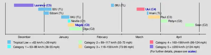 | 13 systems | 8 December – 25 April | 205 km/h (125 mph) | 925 hPa (27.32 inHg) | $81 million | ||||