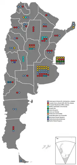 The elections resulted in a setback for the governing, center-left Front for Victory and its allies, which lost their absolute majorities in both houses of Congress.[8] Former President Néstor Kirchner stood as head of his party list in the important Buenos Aires Province. Kirchner's list was defeated, however, by the center-right Republican Proposal (PRO) list headed by businessman Francisco de Narváez; the loss in Buenos Aires Province, though narrow, is significant as the province has been considered a Peronist stronghold and had helped maintain Kirchnerism as the dominant force in Argentine politics since 2003. Buenos Aires Vice Mayor Gabriela Michetti stood as head of the PRO list for the Lower House, and defeated four other prominent parties; the evening's surprise in Buenos Aires, however, was that of filmmaker Fernando Solanas' left-wing Proyecto Sur, which obtained second place.[9][10]