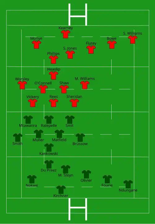 | Try: Frolick 36' c Con: Pretorius Pen: Pretorius 14' | Report[32] | Try: Roberts (2) 6' c, 40' c O'Driscoll 10' c Monye (2) 21' m, 68' c Croft 29' c Bowe (2) 47' c, 57' c Hook 74' c Ferris 80' c Con: S. Jones (6/7) Hook (3/3) Pen: S. Jones (2) 12', 17' |