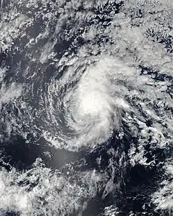 A tropical wave departed the west coast of Africa on June 25, which moved across the Atlantic without development. The wave entered the eastern Pacific on July 4, later developing more convection on July 8 to the south of Mexico. Early on July 10, convective banding features developed along the periphery of the system[36] and an area of low pressure developed within the wave.[37] On July 10, the NHC designated the system as Tropical Depression Four-E about 900 mi (1,400 km) south of the southern tip of the Baja California Peninsula. Soon after, it strengthened into Tropical Storm Carlos while moving westward through an area of warm waters and light wind shear. On July 11, Carlos intensified further into a minimal hurricane. At that time, the small storm developed a small eye-like feature, which had disappeared the next day, causing Carlos to weaken back into a tropical storm. The eye feature redeveloped, signaling that Carlos reintensified into a hurricane on July 14, reaching peak winds of 105 mph (169 km/h) early the next day. Located at 10.1ºN, this made Carlos the southernmost Category 2 hurricane in the eastern Pacific proper. Late on July 15, the hurricane encountered strong wind shear, resulting in rapid weakening. About 24 hours after its peak intensity, Carlos deteriorated into a tropical depression, and dissipated early on July 17 well to the southeast of Hawaii.[36]