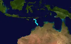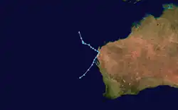 On 15 December a monsoonal low developed about 500 km north-west of Exmouth, Western Australia. The system drifted slowly to the south-east. Gales and heavy rain reached areas far from the centre of the system which crossed the coast near Coral Bay on 18 December. However, shortly after landfall the system turned sharply to the south-west and reached the Indian Ocean west of Carnarvon on 19 December. It moved away from the coast and dissipated late on 20 December some 500 km west of Geraldton.[23]