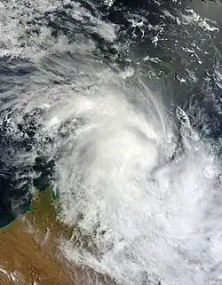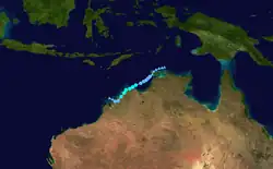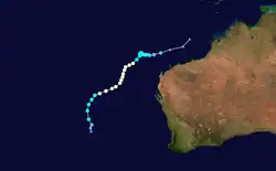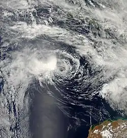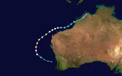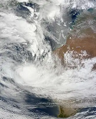 At midnight on 10 January, the Bureau of Meteorology (BoM) reported that a Tropical Low had developed off the coast of Western Australia.[27] The system gradually intensified and became a Category 1 tropical cyclone on 12 January, receiving the name "Vince".[28] The cyclone was initially expected to reach Category 2 status, but it became less well organised and lost cyclone intensity on 14 January.[29]
