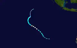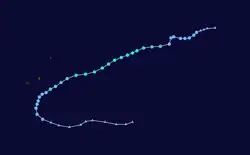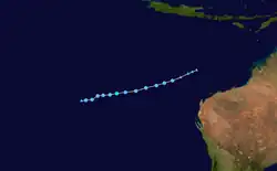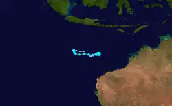 During 3 December, the BoM reported that Tropical Cyclone Abele had moved into the Australian Region from the South-West Indian Ocean, as a category 2 tropical cyclone with 10-minute sustained winds of 95 km/h (60 mph).[20] As it entered the region the system was located well to the southwest of the Cocos (Keeling) Islands, with the JTWC reporting that the system was equivalent to a category 1 hurricane with 1-minute sustained windspeeds of 120 km/h (75 mph).[20][21] Over the next day Abele weakened further because of cooler sea surface temperatures and increasing vertical wind shear, before it was last noted by both the BoM and JTWC during 5 December.[22][20][21]