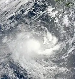 Tropical Low 01U was first noted by the BoM and BMKG during 28 October, while it was located to the southwest of Sumatra, Indonesia.[16] Over the next day, the system moved slowly westwards, as atmospheric convection started to wrap into its consolidating low-level circulation centre, in an area of light to moderate vertical wind shear.[17][18] The JTWC subsequently issued a tropical cyclone formation alert on the system during the following day, as the system turned southwards and interacted with a mid-level trough of low pressure.[16][18]
