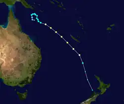 During 22 January TCWC Brisbane reported that Tropical Low 11U had developed within the northwestern Coral Sea to the northeast of Cairns, Australia.[22] Over the next day atmospheric convection developed and organised over the systems low level circulation, as it moved southeastwards away from the Queensland Coast under the influence of an upper-level trough of low pressure.[22] The JTWC subsequently initiated advisories on the system early on 23 January and designated it as Tropical Cyclone 09P, before TCWC Brisbane reported that the system had developed into a category 1 tropical cyclone and named it Anthony.[22][31] During that day the system may have become a category 2 tropical cyclone as radar and microwave imagery showed that Anthony had a well defined circulation and was forming a partial eyewall.[22] The system subsequently moved into an area of higher vertical windshear and weakened into a tropical low during 24 January as it moved into the South Pacific basin.[22]
