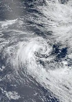 Gradually intensifying, the system moved steadily to the west-southwest, steered around the northern periphery of a ridge.[56] Late on March 17, the MFR upgraded the depression to Moderate Tropical Storm Cherono.[53] This marked the latest date for the third named storm of a season.[4] On March 18, Cherono attained peak 10 minute winds of 75 km/h (45 mph) according to the MFR,[53] and 1 minute winds of 85 km/h (55 mph) according to the JTWC.[7] After that time, the circulation became exposed from the convection, affected by dry air in the region,[57] as well as increased wind shear.[58] On 19 March, the JTWC discontinued advisories,[7] and operationally the MFR downgraded the system to a tropical depression that day,[58] although a post-season analysis indicated Cherono remained a moderate tropical storm for two more days.[53] At 21:00 UTC on 19 March, the storm passed about 40 km (25 mi) south of Rodrigues island, producing winds of 31 km/h (20 mph).[59] The storm continued producing pulsing convection, increasing over the center on 20 March due to a temporary increase in wind shear.[60] However, the shear returned and the convection weakened on 21 March due to an approaching upper-level trough,[61] and Cherono weakened to tropical depression status.[53] The same trough turned the storm to the south and southeast.[62] On 23 March, the system became extratropical as it curved eastward. The low weakened further the next day, dissipating on 25 March.[53]