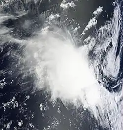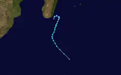 On December 28, the ITCZ spurred an increase in convection in the northeastern portion of the basin.[30] An elongated low-pressure area developed by 31 December, accompanied by intermittent thunderstorms.[30] The system slowly consolidated, and the circulation center was exposed but well-defined.[31] Despite moderate wind shear, the convection organized into rainbands on the system's southern periphery.[32] On 2 January, the MFR classified the system as Tropical Disturbance 03,[33] and later that day upgraded it to a tropical depression.[34] However, persistent shear caused the convection to diminish on 3 January, which exposed the circulation.[35] As a result, the MFR discontinued advisories on the system that day.[36] The remnants produced scattered convection while moving west-southwestward.[37] By 10 January, the circulation was still observed, although it was difficult to track.[38] Two days later, the system turned southward,[39] and by 15 January, the convection became more persistent as the system approached northeastern Madagascar.[40] That day, the JTWC issued a Tropical Cyclone Formation Alert based on the improved appearance on satellite imagery.[41] At around 05:00 UTC on 16 January, the remnants of the depression struck Madagascar near Fenoarivo Atsinanana,[42] and the system rapidly dissipated over land.[43]