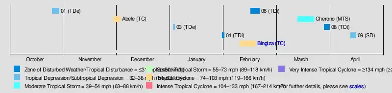 There were nine tropical or subtropical cyclones during the season, including five weak tropical disturbances or depressions, mostly in the northeastern portion of the basin or to the east of Madagascar. The first of these systems developed on 25 October 2010, which had its origins in the northeastern portion of the basin. On 29 November, the first named storm – Abele – also formed in the same area, strengthening to become one of the season's two tropical cyclones – storms with maximum sustained winds of at least 120 km/h (75 mph). The strongest system of the season was Cyclone Bingiza, which attained peak winds of 160 km/h (100 mph) off the northeastern coast of Madagascar in February. Bingiza was also the only storm to cause severe effects on land, causing heavy damage and 34 fatalities across Madagascar. Moderate Tropical Storm Cherono developed in March and traversed much of the ocean, only brushing by the island of Rodrigues. The final system was a subtropical depression that intensified south of Madagascar, becoming extratropical on 16 April to end the season.