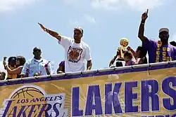 On June 21, a victory parade took place for the Lakers. Unlike like previous years, however, there was no pep rally that followed after the end of the parade due to both security and financial reasons.[51] The team was transported around on an open-air float equipped with loudspeakers enabling the players to talk to the spectators. The parade began at 11 a.m local time at Staples Center, turned east on Chick Heart Court, turned south onto Figueroa Street, then east onto Jefferson Boulevard before entering beneath Interstate 110.[51] The parade concluded at the intersection of Jefferson Boulevard and Grand Avenue near the University of Southern California's Galen Center.[51][52] Occasionally, Ron Artest led the crowd in chanting "Boston sucks!"[53] Over 65,000 people were estimated to have attended the parade.[54] Most of the 2009–10 Lakers team were on hand to receive their championship rings before the start of the season opener against the Houston Rockets on October 26.[55] They also visited U.S. president Barack Obama at the THEARC Boys and Girls Club in Washington, DC. in December 2010, presenting him with a banner declaring the Lakers as 2009–10 NBA World Champions.[56][57]