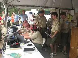 There was a focus on social networking at this jamboree which was entirely new. Generally, Scouts are instructed to leave their electronics at home when on camping trips, but this event was an exception. AT&T, one of the corporate sponsors, provided excellent cell phone coverage and a Wi-Fi network which spanned the entire site. This effected "a better signal in [the jamboree site] than in most residential areas."[6] AT&T also provided netbooks and cell phones for use by the Scouts in their Connection Centers, located throughout the site. There were also secure device charging lockers next to each connection center where phones or other devices could be recharged, although this set-up became controversial after Scouts began keeping the keys to the lockers in order to have a personal charging station. The jamboree trading posts sponsored competitions for videos and pictures submitted by participants. Staff members and signs placed around the site encouraged Scouts to tell about their experiences on various social websites. This allowed parents, siblings, and friends at home to get in on the action and see what was happening. Overall, the event was covered extensively on the internet as well as in local and national news.