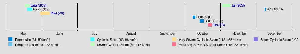 The season officially started on May 17, 2010, with Cyclone Laila and ended on December 8, 2010. During the season, cyclones Laila, Phet, Giri and Jal along with Bandu caused excessive life loss across the Indian Subcontinent and the Middle East.