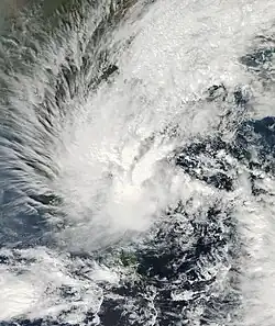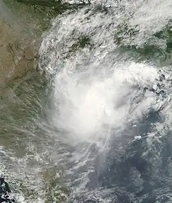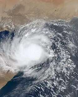 Early on May 30, the India Meteorological Department (IMD) and the Joint Typhoon Warning Center (JTWC) reported that an area of low pressure had formed about 925 km (575 mi), to the southwest of Mumbai, India. The area of low pressure had loose organized convection developing around the low level circulation center within the monsoon trough. The system was located to the south of a high pressure center anchored over Oman in an area of moderate vertical windshear. On May 31, the India Meteorological Department (IMD) upgraded an area of low pressure to a depression, giving it the designation "ARB 02".[12] The IMD further upgraded the depression into a deep depression the next day.[13] JTWC reported the same day that a Tropical Storm had formed.[14] On June 1, IMD upgraded the system into a cyclonic storm and named it "Phet".[15] The storm intensified to a Severe Cyclonic Storm in early hours of June 2.[16] The same day IMD upgraded the storm to a Very Severe Cyclonic Storm.[17] By the 5th, the cyclone had been downgraded to a cyclonic storm by the IMD as it passed over the Gulf of Oman.[18] On the 7th, Phet dissipated completely.[19]