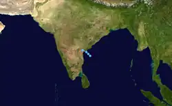 In early December, a low-pressure area formed over the Bay of Bengal. The low-pressure area moved towards the Indian coast and became more well marked. On December 7, the India Meteorological Department (IMD) upgraded the area of low pressure to a depression giving it the designation "BOB 06". At that time it was located approximately 450 kilometres (280 mi) south-southwest of Visakhapatnam, Andhra Pradesh, India.[73] Until December 8, the depression moved northwestwards and made landfall at Bapatla, Andhra Pradesh, India where it dissipated into a remnant low soon after the landfall.[74][75]