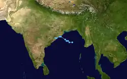 On October 7, the India Meteorological Department (IMD) upgraded an area of low pressure to a depression, giving it the designation "BOB 02". At that time, the depression was located approximately 180 km (110 mi) southeast of Visakhapatnam.[20] Later that day, the IMD reported that the system was 120 kilometres (75 mi) east of Visakhapatnam.[21] On the same day, the IMD reported that the system moved away from Visakhapatnam and maintained strength. The system was forecast to make landfall between Gopalpur and Paradip overnight but the depression made landfall over Paradip late on October 7 instead.[22] On October 8, the IMD reported that the system had weakened slightly.[23] Later on that day, the IMD reported that the depression had further weakened.[24] The storm made its second landfall at Kolkata, West Bengal, India.[25] Signal 3 cyclone alert was issued at the Maritime ports of Chittagong, Cox's Bazar and Mongla.[26] The Depression continued to weaken as it moved northwest until it was caught up in the jet stream and completely absorbed by a non-tropical storm early on October 9.[27]