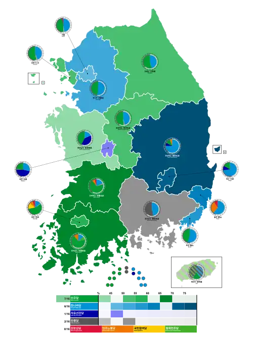 The ruling GNP was able to win 4 out of 7 mayoral seats but suffer by massive landslide on the gubernatorial election winning only 2 out of 9 seats. On the other hand, DP was able to capture 2 mayoral seats and swept 5 out of 9 gubernatorial seats. The LFP won Daejeon while two independent candidates won gubernatorial seats in South Gyeongsang Province and the other in Jeju Province.