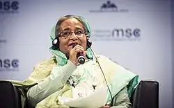 In 2013, the hard-line, right-wing, Islamic party, Jamaat-e-Islami was banned from registering and therefore contesting in elections by the High Court, citing their charter violates the constitution.[2][3] Street violence between the League, BNP and the Jamaat intensified in the run up to the general election. In 2014, the general elections were boycotted by the BNP. The elections were criticized by the United States, United Kingdom, European Union and the United Nations.[4] Sheikh Hasina was sworn in for a third tenure as prime minister.