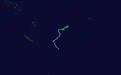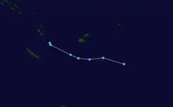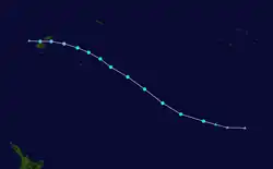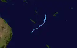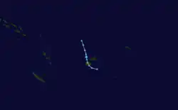 On February 5, the FMS reported that a tropical disturbance had developed, about 310 km (190 mi) to the southeast of Nadi, Fiji.[22][23] During that day the disturbance moved towards the northeast and passed through the Fijian islands, while convection surrounding the system increased and organized before it was declared a tropical depression early the next day.[24] Later that day as the system started to move towards the southeast it rapidly consolidated further with the JTWC and the FMS both reporting that the depression had developed into a tropical cyclone, with the later naming it Cyril as it moved south-eastwards through the Tongan islands.[25][26] Early on February 7 after Cyril had moved through Tonga, the JTWC reported that Cyril had peaked with 1-minute windspeeds of 100 km/h (60 mph), which made it equivalent to a tropical storm.[27]