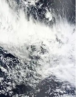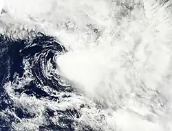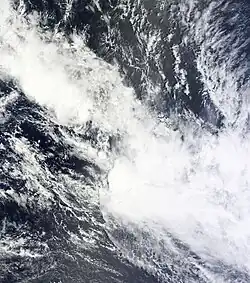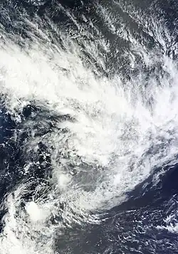 On January 8, RSMC Nadi reported that Tropical Depression 04F had developed, about 465 km (290 mi) to the west of Papeete on the French Polynesian island of Tahiti.[13] 04F had an exposed low level circulation centre and was situated to the east of a trough of low pressure and to the west of an area of enhanced convection.[13] Over the next 24 hours, convection surrounding the system became increasingly displaced to the far east of the exposed low level circulation centre because of strong vertical wind shear.[14] As a result, RSMC Nadi issued their final warning on 04F, late on January 9.[14]