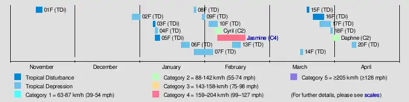 Despite predictions of between 5-8 tropical cyclones occurring within the South Pacific Basin, with only two tropical cyclones developing in the basin, while Jasmine moved in from the Australian region. The first tropical disturbance of the season developed on November 13, to the north-east of Fiji and moved south-eastwards before it weakened into an area of low pressure during November 17, as it affected Fiji.