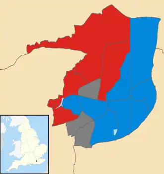 ![]() Map showing the results of the 2011 Crawley Borough Council elections by ward. Blue show Conservative seats, and red shows Labour. Wards in grey had no election.