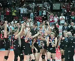 2011 FIVB Girls Youth Volleyball World Championship awarding ceremony. World Champion Turkey celebrates with the cup.
