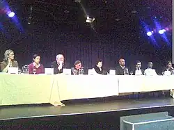 The second televised debate organised by the Finnish Broadcasting Company on 14 April was the last before the election and it included all the eight parliamentary parties. The economy was a dominant theme of the debate. Jutta Urpilainen reiterated her claim that the incumbent government was furthering the establishment of a flat tax. She also accused the government for advancing the interests of the richest percentage at the expense of the poor people. Jyrki Katainen denied the claims, but the two main governing coalition parties, the NCP and the Centre Party, were the only parties opposed to increasing welfare for the unemployed.[86] Prime Minister Mari Kiviniemi of the Centre Party had previously been quiet on spending cuts, but when pressed on the issue by the debate's moderator she was rather indiscreet on cutting funding for the public sector and the Defence Forces. However, she still insisted that cuts may not be necessary if the economic growth is sufficiently high in the following years.[87] Cuts on defence spending were supported by most parties, but Timo Soini contested this by saying that national security can not depend on economic conjectures.[88] The crisis concerning the breaches against the campaign funding laws during the previous electoral campaign in 2007 was also discussed. Kiviniemi admitted that mistakes had been made. Soini called the mishandling an example of corruption and was glad that it was exposed. Kiviniemi discreetly said to Soini that the press had written about events in Soini's party as well. Soini's reply to this was: "The press? Your people are on trial!"[89]
