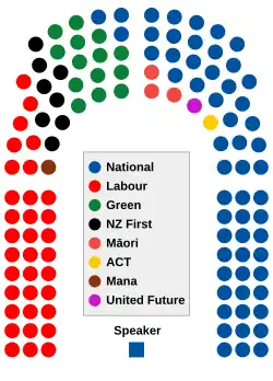 Following the election, National reentered into confidence and supply agreements with ACT and United Future on 5 December 2011,[6][7] and with the Māori Party on 11 December 2011,[8] to form a minority government with a seven-seat majority (64 seats to 57) and give the Fifth National Government a second term in office.