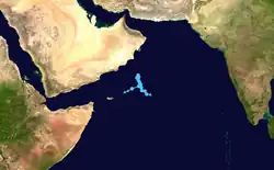 On November 6, the IMD upgraded a low-pressure area into a Depression, designating it ARB 03. The system was forecasted to intensify into a deep depression and move towards the Gulf of Aden in the next 72 hours.[39] On the same day a TCFA was issued by the JTWC.[40] The IMD upgraded the storm into a deep depression on November 8, and forecasted that it would intensify into a cyclonic storm within the next 24 hours[41] which was followed by an upgrade to a tropical storm by JTWC.[42] Under the influence of unfavorable conditions and proximity to land, the system weakened and JTWC issued its final warning.[43] Soon the IMD downgraded the storm into a depression.[44] On November 10, the storm dissipated into a low-pressure area.[45]