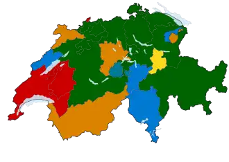 This lists parties that won seats. See the complete results below.  Map of Swiss cantons shaded by the party that won the most votes. The Swiss People's Party dominated German-speaking Switzerland, while the Social Democrats were the largest in the French-speaking west. |