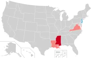 In Mississippi, Democrats controlled the House of Representatives, while Republicans controlled the governorship and gained control of the Senate early in the year due to party switching.[3] Typically, the Mississippi legislature followed the tradition of each chamber passing the others' maps without interference; however, the Republican-controlled Senate voted to reject the Democratic-passed House of Representatives map, deadlocking the redistricting process and drawing several lawsuits, including from the NAACP.[13] As the legislature showed no signs of resolving its impasse, federal courts took up the process. The NAACP sought new maps to remedy the population disparities that had grown between districts in the preceding decade, while some Republicans sought to hold the 2011 elections under the previous maps while passing new maps and holding new elections in 2012.[14] The judges ruled to conduct the elections under the previous decades' maps, agreeing that redistricting was not required to take place until 2012.[15] After the 2011 elections, the newly Republican-controlled legislature passed new legislative maps, but elections were not held again until 2015.