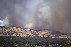In the hours after midday the fire spotted across John Renshaw Parkway and breached the containment line, burning with flames of up to 33 m (108 ft) and impacting upon the Warrumbungle Visitors Centre, where a number of New South Wales Rural Fire Service and NSW National Parks & Wildlife Service employees were sheltering. By mid-afternoon, the fire was spreading downwind at a rate of 3.7 km/h (2.3 mph) and the NSW Police commenced evacuations to the east of the fire, including at Siding Spring Observatory. The observatory was impacted by the fire in the late afternoon, causing the destruction of three buildings in the complex; 'The Lodge' accommodation used by visiting researchers, the Director's Cottage and the Fire Station.[46][47] Throughout the evening a 14 km (8.7 mi) high pyrocumulonimbus cloud formed above the blaze, creating unpredictable winds, intense spotting and other extreme meteorological conditions; the fire burned to the east, along Timor Rd., burning to within 13 km (8.1 mi) of Coonabarabran township.[19] A southerly wind change passed through the fire ground some time after 18:00 AEDT, causing hot ash and embers to fall in Baradine, 50 km (31 mi) north of Coonabarabran, throughout the night and prompting the Baradine local hospital to secure the windows with damp towels to prevent the entry of smoke and ash.[19]