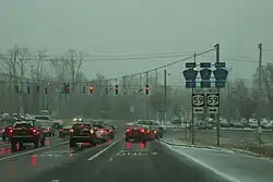 Delays occurred on the Cross County Parkway in New York as a result of the snow,[34] and a bus carrying the Harlem Globetrotters basketball team crashed in Marlborough, Massachusetts on I-290.[35][32] The World Trade Center (PATH station) closed briefly during the evening of March 18, because of falling ice from 1 World Trade Center.[36] Around 3 inches (7.6 cm) of snow fell in Central Park, though accumulations were more significant in the Bronx and New Jersey.[37] Two semi-trucks jackknifed on the eastbound lanes of I-84 in Connecticut which closed four lanes altogether,[37][38] and an accident involving a tractor-trailer closed an off-ramp on I-91 in Wallingford, Connecticut.[39] Several vehicle crashes occurred in the Greater New Haven area.[39] Numerous flights were cancelled at Portland International Jetport in Portland, Maine, while several flights were also cancelled at Bangor International Airport.[40] Vehicle accidents resulted in several minor injuries across Maine. At least 545 flights were cancelled, and at least 139 power outages occurred across Maine.[35][40] As a result of the heavy snowfall, the Massachusetts Department of Transportation deployed 2,800 trucks to clear snow across roadways.[41] One person was killed after a vehicle crash on Francis Lewis Boulevard in Queens, New York.[37]