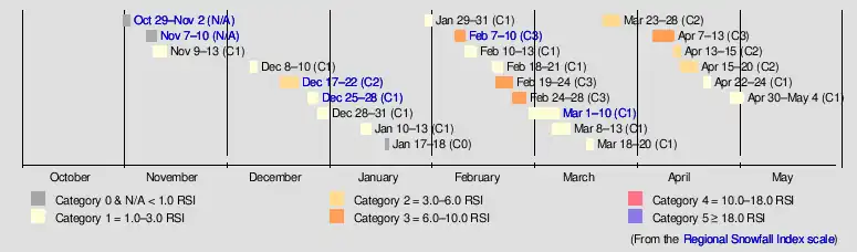 The 2012–13 North American winter was the most active winter weather season by metric of the amount of storms rated on the Regional Snowfall Index (RSI), with a record-breaking 21 storms being rated on the scale. The season started out somewhat early, as the remnants of Hurricane Sandy brought heavy snow to the mountains of West Virginia in late October. Later, a strong nor'easter affected the weary Northeastern United States, hampering storm recovery efforts and dropping several inches of snow. The rest of the winter featured several other notable events, such as a Christmas winter storm that affected most of the Eastern United States, and the most notable event occurring in early February, when a powerful blizzard struck the Northeast and brought record snow to some areas. Overall, the majority of the continent, more specifically the central parts of the United States, experienced a persistently wintry and cold pattern that extended into the months of April and May, a theme that would be repeated the following winter on a larger and more widespread scale. During the winter, a weak El Nino was expected to influence weather conditions across the continent.