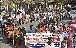 In India, activists of Gairik Bharat burned an effigy of Sheikh Hasina in Silchar, in protest against her failure to protect the Hindu minorities in Bangladesh.[69] The Bharatiya Janata Party, West Bengal unit demands the central government to create pressure on Bangladesh government to protect the Hindus from Islamic extremism.[70] In Rajya Sabha, the upper house of Indian parliament, main opposition Bharatiya Janata Party demanded that an all-party delegation be sent to Bangladesh to assess the "atrocities on Hindus" by Jamaat-e-Islami.[71] On the other hand, Muslim radicals of West Bengal stand for Delwar Hossain Sayeedi and Jamaat-e-Islami with conviction.[72][73] Expressing serious concern on the continued attacks on the Hindus in Bangladesh the South Assam Bengali Hindu Association demanded the intervention of the Indian President Pranab Mukherjee in stopping the atrocities on Hindus in Bangladesh.[74]