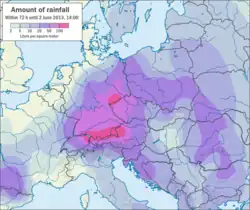 On 30 May to 1 June, 150 to 200 mm of rain (5.9 to 7.9 in of rain) fell, in places reaching around 250 mm (9.8 in), which in just a few days was the equivalent normally seen over two and a half months on average.[11] The rainfall experienced in Austria has an expected return period of between 30 and 70 years. The bulk of the rain fell in only two days in Salzburg, Tyrol, and Vorarlberg, which is thought to have a return period of more than 100 years.[12]