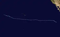A tropical wave emerged off the western coast of Africa on July 19 and reached the East Pacific on July 26. Embedded within the Intertropical Convergence Zone, convection slowly coalesced about an area of low pressure, leading to the formation of a tropical depression by 12:00 UTC on August 3; twelve hours later, the depression intensified into Tropical Storm Henriette while located about 1,800 mi (2,900 km) southwest of the southern tip of Baja California. The system initially moved west-southwest following formation, but turned toward the west-northwest as it reached the western periphery of a mid-level ridge to its north. Amid a favorable environment, Henriette steadily intensified, becoming a Category 1 hurricane by 06:00 UTC on August 6 and unexpectedly attaining peak winds of 105 mph (170 km/h) by 18:00 UTC on August 8. The hurricane quickly weakened over increasingly cool waters as it resumed its southwesterly track into the Central Pacific, weakening to a tropical storm early on August 9 and further to a tropical depression two days later. By 18:00 UTC on August 11, the effects of increasing wind shear caused Henriette to degenerate into a remnant low while positioned roughly 430 mi (690 km) south of Kailua-Kona, Hawaii. The remnant low drifted west-southwest until dissipating the next day.[65]