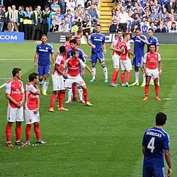 On 27 September, Arsenal faced Tottenham Hotspur in the North London derby at the Emirates Stadium. The match ended in a 1–1 draw; Spurs' Nacer Chadli gave his side the lead early in the second half, but Arsenal responded with Alex Oxlade-Chamberlain's effort against a wrong-footed Tottenham defence with 15 minutes left in the match. After the game, Wenger voiced his frustration at Arsenal's set-piece routines saying that the players did not create enough from these opportunities; Wenger also mentioned that Ramsey and club captain Mikel Arteta sustained muscular injuries, and they would be temporarily unavailable.[41] Arsenal's misfortune continued when they lost 2–0 against rivals Chelsea at Stamford Bridge, with the "Blue's" Eden Hazard and Diego Costa on the scoresheet. The loss meant the Wenger had not defeated Chelsea manager José Mourinho after 12 different attempts.[42] Arsenal also lost playmaker Özil to injury during the match and could not play for three months.[43]