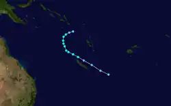 On March 19, RSMC Nadi had reported that Tropical Disturbance 12F had developed about 375 km (235 mi) to the southwest of Apia on the Samoan island of Upolu.[25] The system moved southwards as it was classified as a tropical depression. On March 21, the JTWC classified 12F as a tropical storm, giving the designation 20P. Early on March 22, RSMC Nadi reported that the system had developed into a category 1 tropical cyclone and named it Reuben, while it was located about 220 km (135 mi) to the south of Nukuʻalofa, Tonga.[26] Early on March 23, both agencies discontinued issuing advisories as Reuben entered a phase of extratropical transition.
