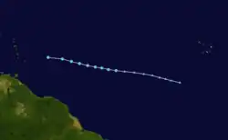 A tropical wave emerged off the western coast of Africa on July 17. Steered westward, a small area of low pressure developed in association with the wave two days later. Convection steadily increased and organized, leading to the formation of a tropical depression by 12:00 UTC on July 21. The depression failed to intensify into a tropical storm amid an exceptionally dry and stable environment and instead degenerated into a trough by 18:00 UTC on July 23 while located east of the Lesser Antilles.[43]