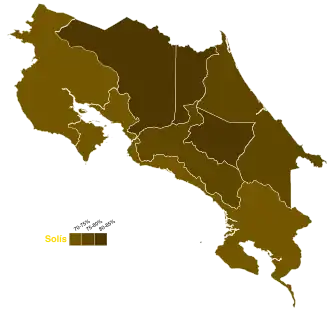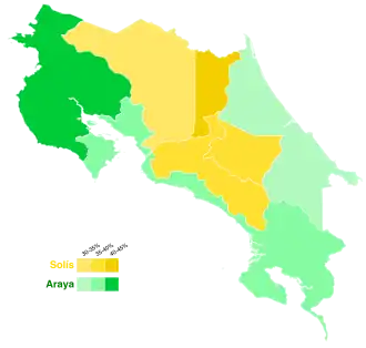 In a surprise move, Araya announced on 6 March that he would abandon his campaign for the run-off election. He stated that after weighing his chances it was only sensible to withdraw from the campaign. Recent polls had indicated that he was trailing badly behind Solís and he believed that spending money on campaigning was not prudent. Although Araya's action effectively handed the presidency to Solís, the run-off still had to take place since Costa Rican law does not allow for a candidate to withdraw from a run-off election.[7] Ultimately, Solís won the second round with 78 percent of the vote, a historic high in Costa Rica.[8][9] Unlike the first round, Solís won a majority in every province.[10]
