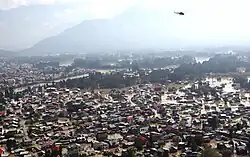 In Srinagar, most of the city areas were submerged under water. The river Jhelum spilled over submerging Sonwar Bagh, Shivpora,[15] Batwara, Soitang, Lasjan, Padshai bagh, Natipora, Pandrathan, LalChowk, Rajbagh, Jawahar Nagar, Gogji Bagh and Wazir Bagh neighbourhoods of city. The first and the second storey of the houses and hotels in Rajbagh that were packed with tourists were submerged.[16] According to Omar Abdullah, the Chief Minister of Jammu and Kashmir then, boats had been brought from Delhi to help with evacuations, and the air force had begun rescue operations in the city.[17]
